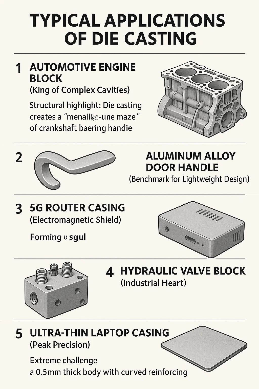نکات برجسته سازه: دایکستینگ یک "پیچ و خم سه در یک" از محفظه های یاتاقان میل لنگ، کانال های آب خنک کننده و گذرگاه های روغن را در یک فرآیند واحد ایجاد می کند، مانند ریخته گری شبکه ای از تونل های فلزی متصل به هم در داخل یک قالب فولادی.