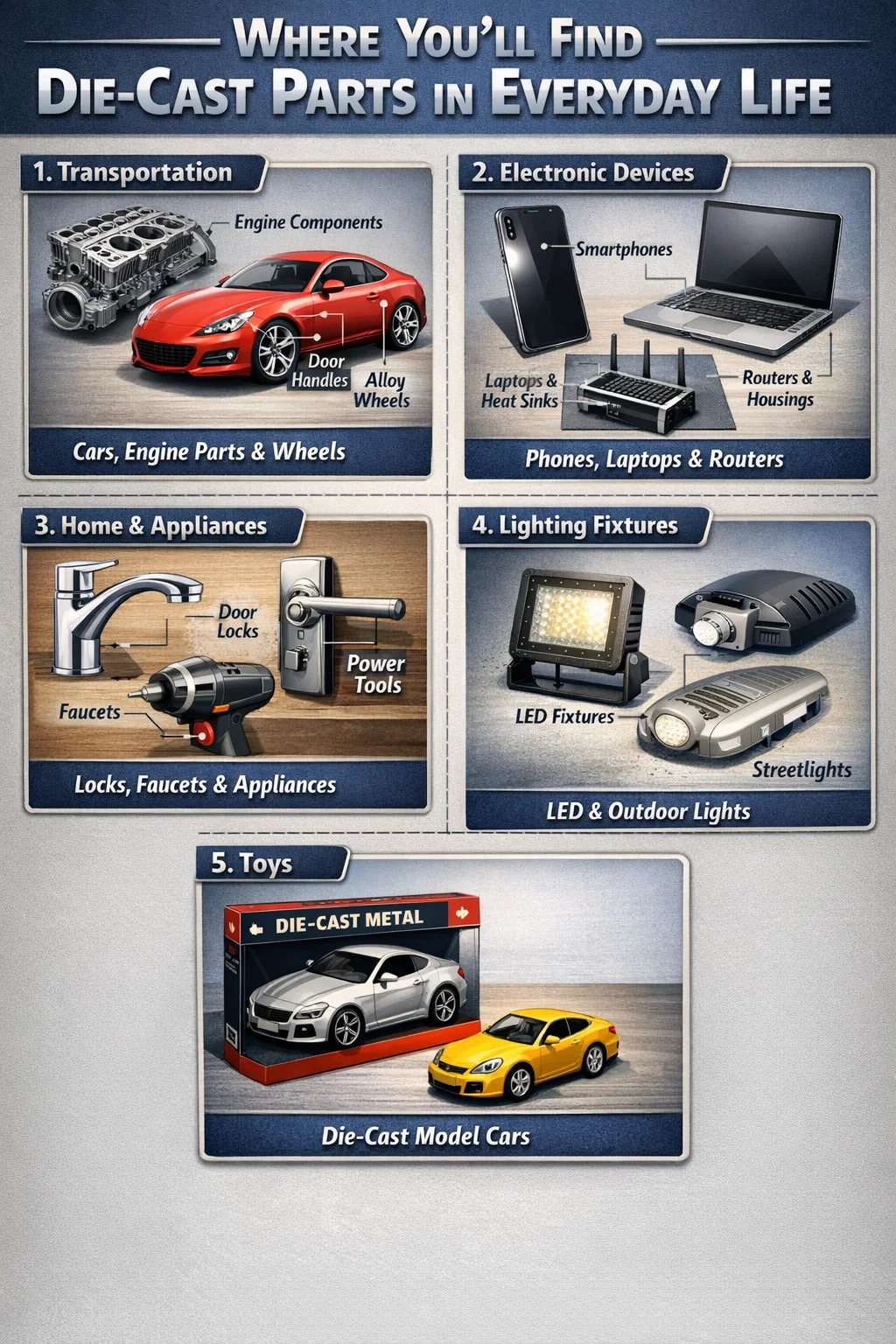 دایکستینگ در درجه اول برای تولید اقلامی استفاده می شود که به دوام، شکل های دقیق و تولید انبوه نیاز دارند. در اینجا برخی از رایج ترین موارد استفاده در زندگی روزمره ما آورده شده است: