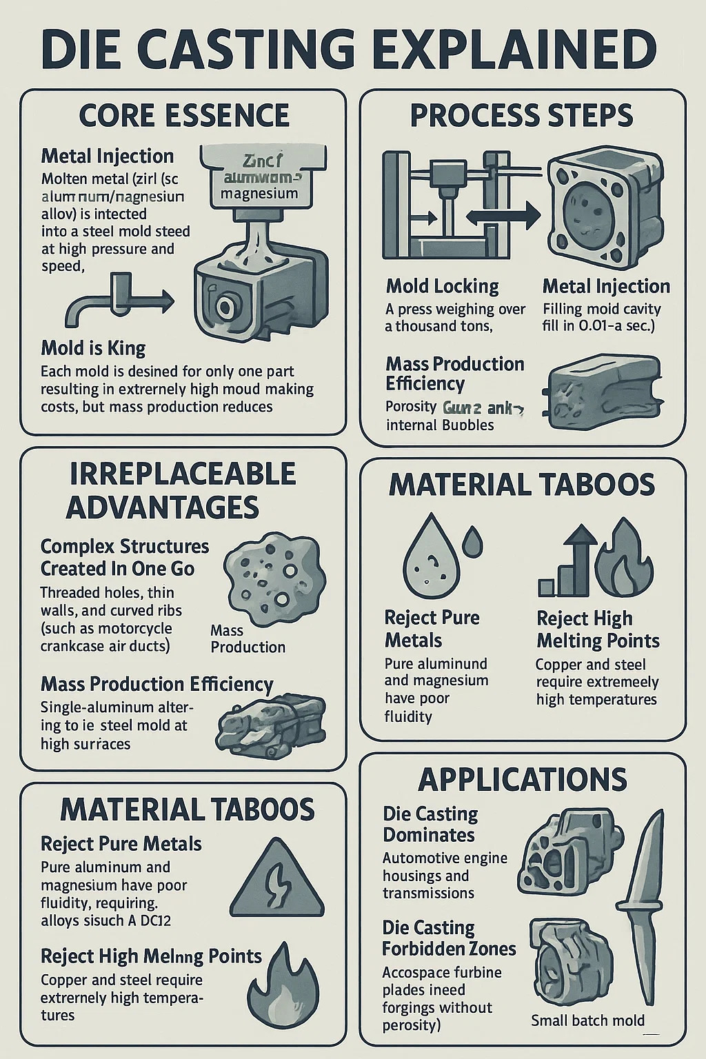 قالب تزریق فلزی: فلز مذاب (روی/آلومینیوم/آلیاژ منیزیم) با فشار و سرعت زیاد به قالب فولادی تزریق می شود و پس از خنک کننده از بین می رود تا قسمت تشکیل شود.
