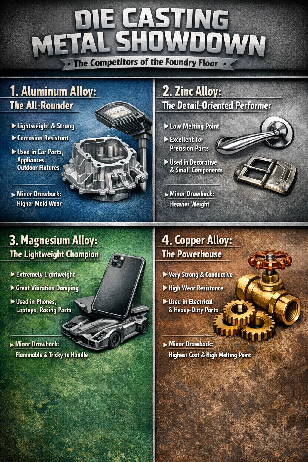 وقتی صحبت از این می شود که کدام فلز برای آن مناسب تر است دایکستینگ ، "شماره یک" مطلق وجود ندارد، زیرا بستگی به این دارد که می خواهید از آن برای چه استفاده کنید. در کارخانجات، سه فلزی که بیشترین استفاده را دارند عبارتند از آلومینیوم، روی و منیزیم.